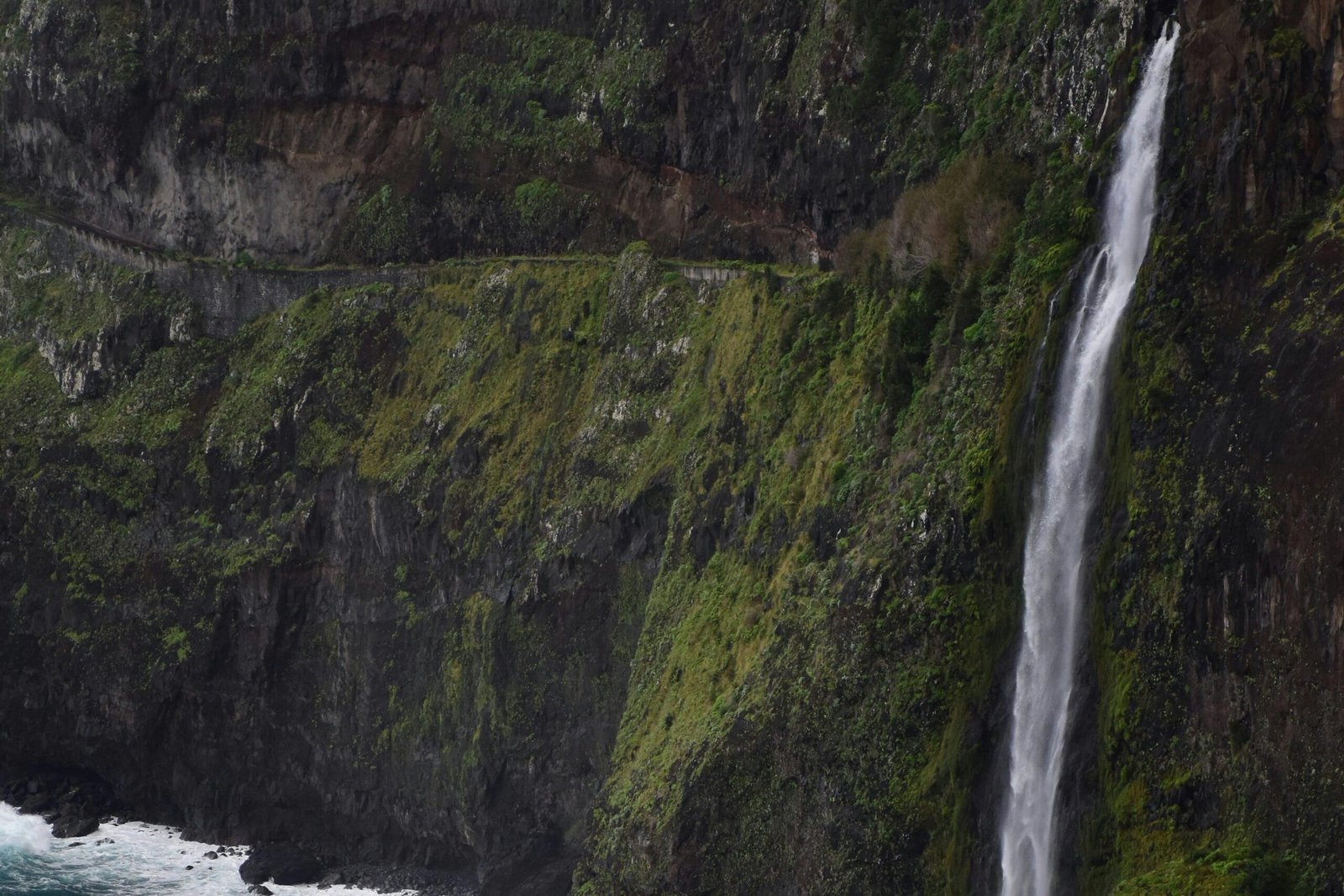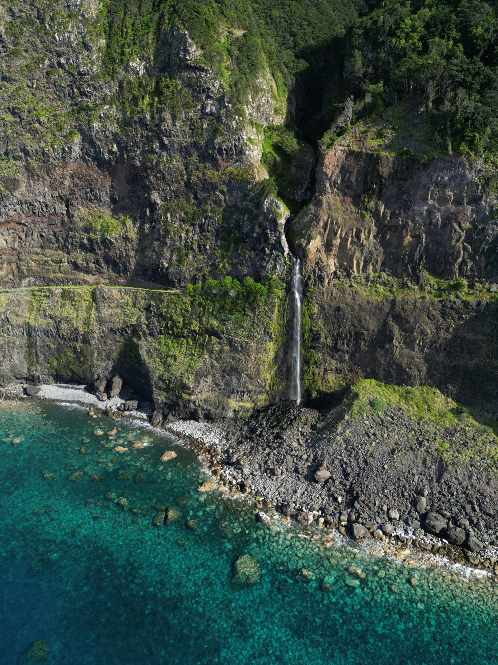 Ce que j’aime vraiment avec cette cascade, c’est son décor. Tu as la falaise couverte de végétation, l’océan juste derrière, et cette cascade qui tombe presque en mode rideau d’eau.
